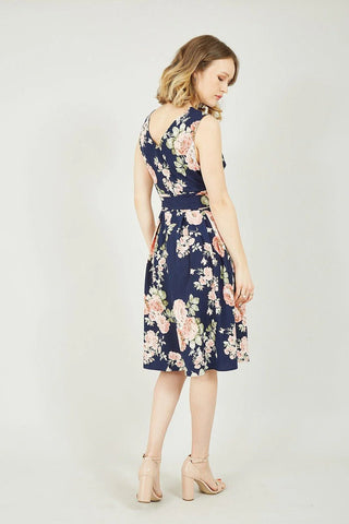 Mela Navy Rose Printed Wrap Over Sleeveless Skater Dress