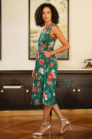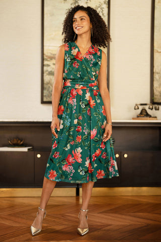 Yumi Green Blurred Floral Print Mesh Stretch Midi Dress With Pockets