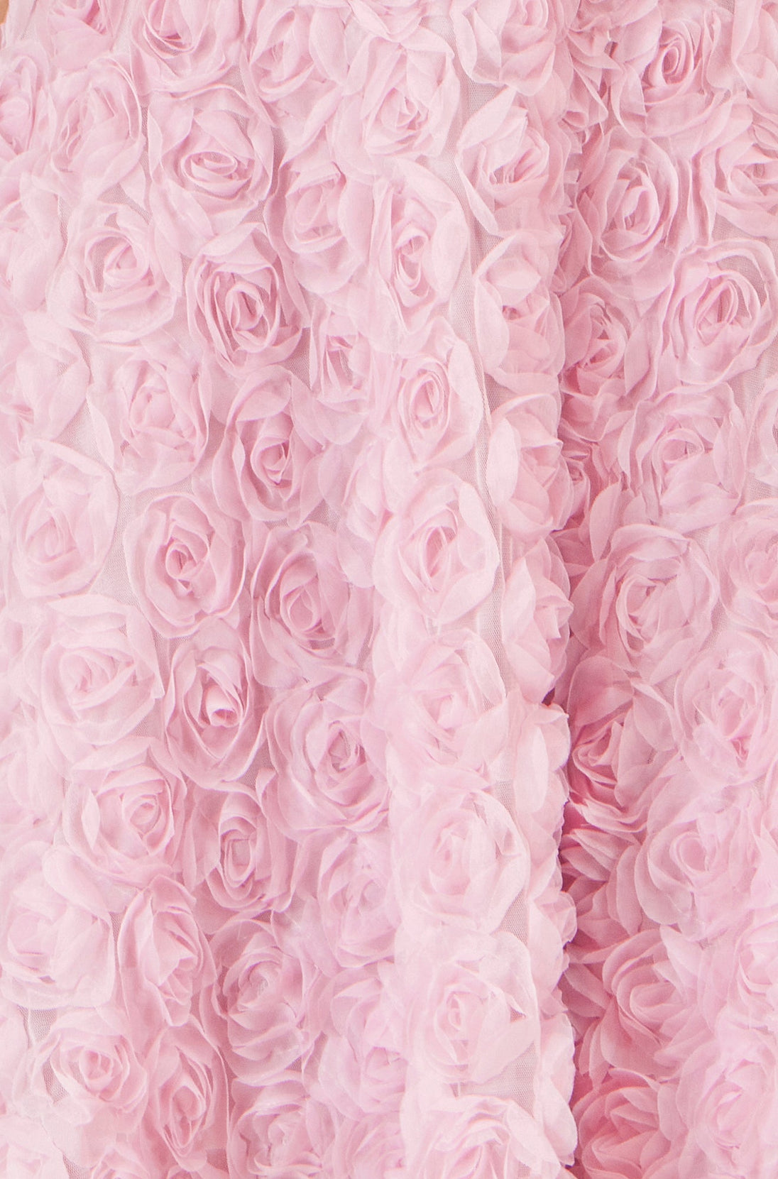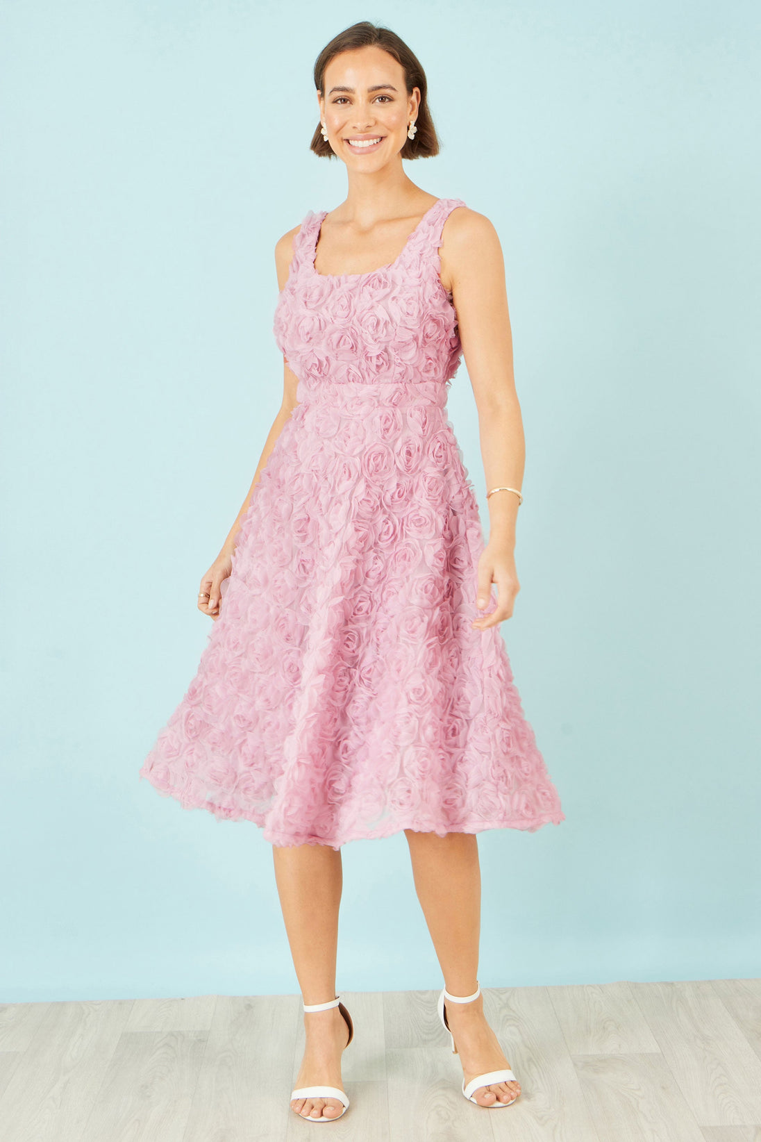 This dress is a charming, feminine piece featuring a soft pink colour and a beautifully textured floral design. The entire dress is covered in three-dimensional rosette appliqués, giving it a romantic, sculpted look. It has a sleeveless bodice with wide straps and a flattering scoop neckline. The fitted waist transitions into a gently flared, knee-length skirt that adds movement and elegance. Overall, it’s a delicate, whimsical dress perfect for special occasions, spring events, or anywhere you want to feel especially graceful and polished.